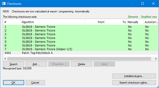 Sumas de verificación automáticas: Cada módulo de suma de verificación (se compra por separado) reconoce automáticamente si se puede utilizar y corrige las sumas de verificación inmediatamente después de cada cambio. Incluso en tiempo real mientras el coche está en marcha. Si aún no tiene el módulo correcto, basta con presionar un botón y se probarán en línea todos los módulos de suma de verificación existentes para su proyecto. De esta manera sabrás con seguridad qué módulo es el correcto. Los módulos se pueden comprar online las 24 horas del día. Recibirá su módulo en cuestión de minutos.