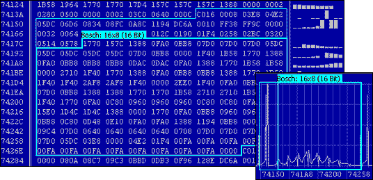- La representación de los datos sin procesar está disponible en gráfico 2D o volcado hexadecimal/decimal. Detección automática del procesador para distinguir entre programa y área de datos.